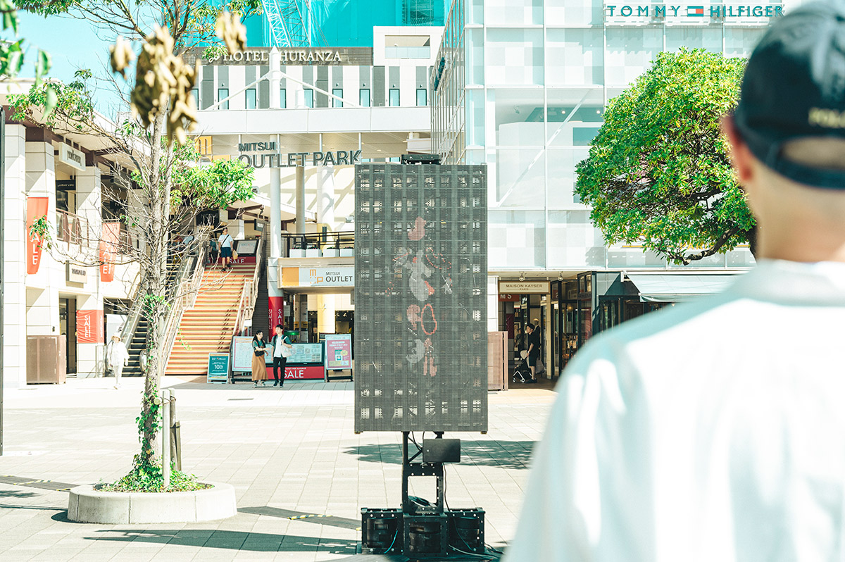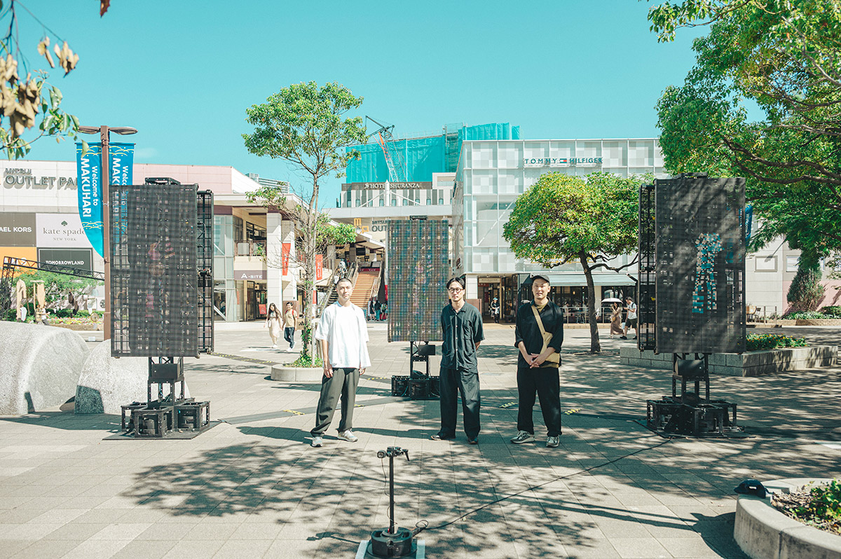飯高:この作品はIE3の田中陽さんと一緒にアイデアを考え、プログラムとインスタレーションの実装も担当してもらっています。流れている音楽はアーティストの村井智さんにつくってもらったオリジナルの楽曲です。海浜幕張駅の駅前から、『SUMMER SONIC』の会場となるZOZOマリンスタジアムと幕張メッセまでの道のりで、街全体が踊っているような雰囲気をつくりたかったんです。