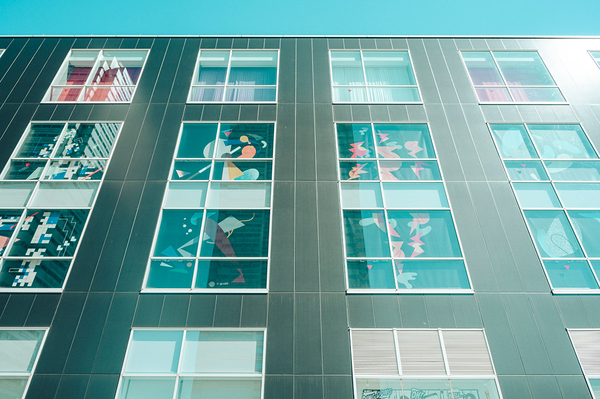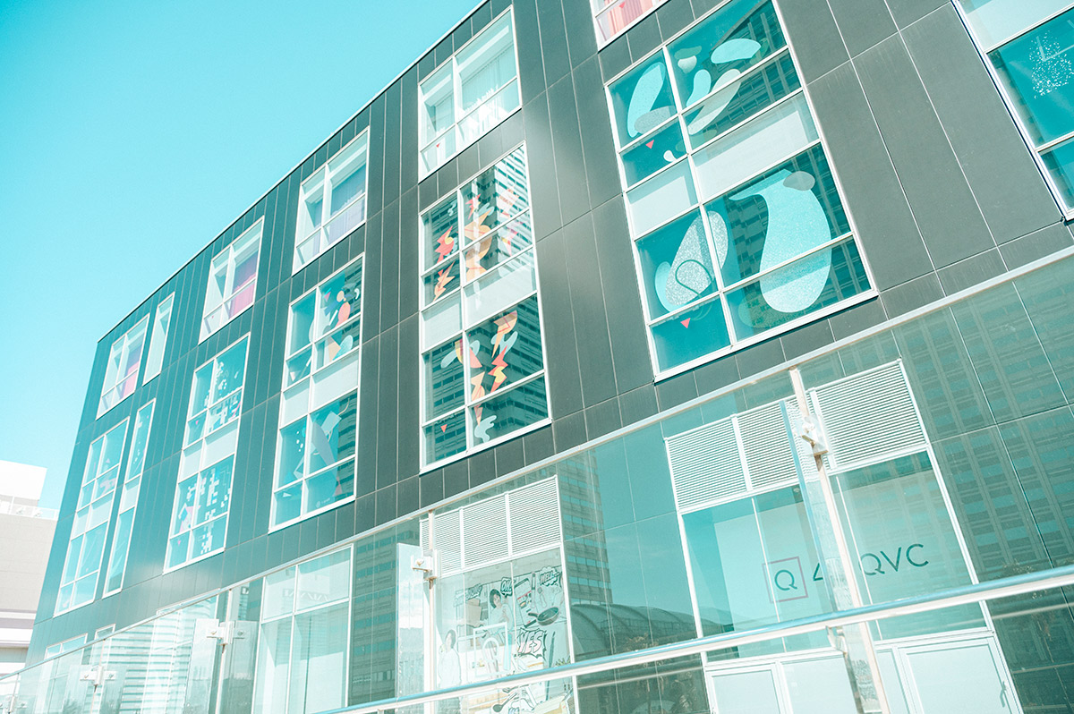 QVC ジャパン本社の窓に、GOO CHOKI PARによる10体のダンサーのグラフィックが並ぶ。