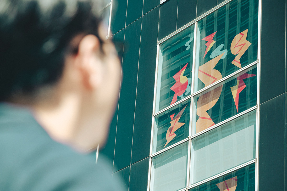 飯高:QVCジャパンさんから「この窓を使って作品を展示してほしい」というオーダーをいただきました。そこで、プリントしたグラフィックを窓の内側に掛けています。これほど平面的に整然と並んでいる大きな窓というのは珍しいので、踊りをテーマにした本作がうまくハマったと思います。