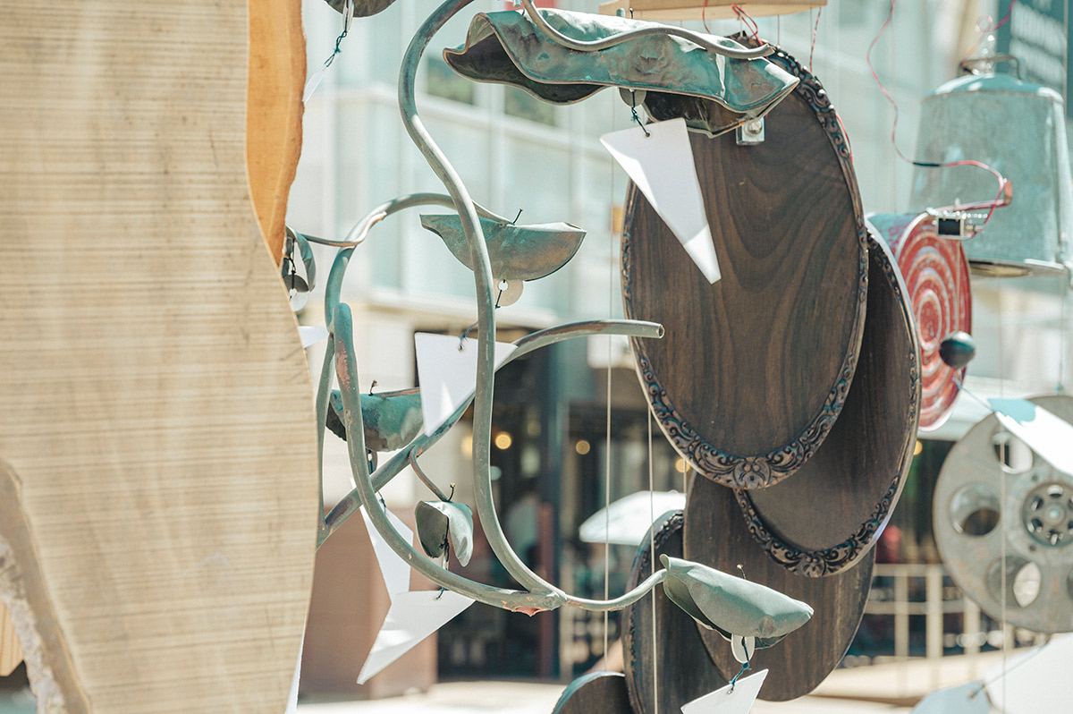 金属や木材、竹、プラスチックなどでつくられた風鈴が吊り下げられており、自然の風と人工的な電子制御によって音が鳴る。