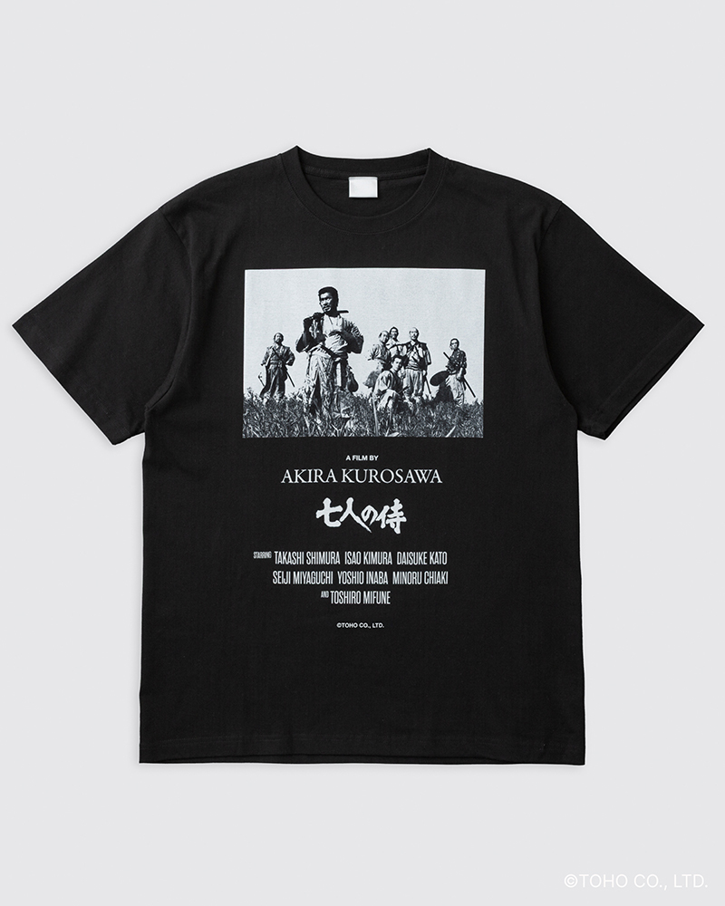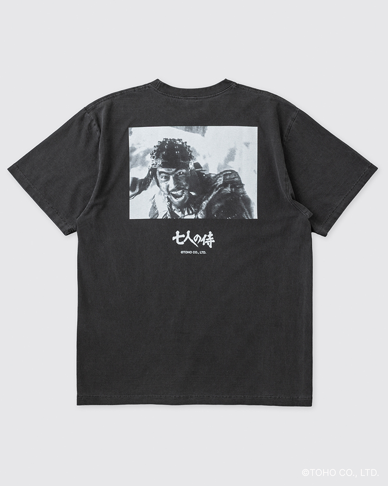 菊千代Tのフロントの胸元には英字タイトル『SEVEN SAMURAI』とクレジットをデザイン。バックには三船敏郎が演じた破天荒な侍・菊千代のワンカットがプリントされている。プリントの下には『七人の侍』のロゴ入り。生地は6.6ozでビンテージ感を再現。ピグメント染めのビンテージブラックにポスターTと同様のラバープリントのシルクスクリーンが採用されている。