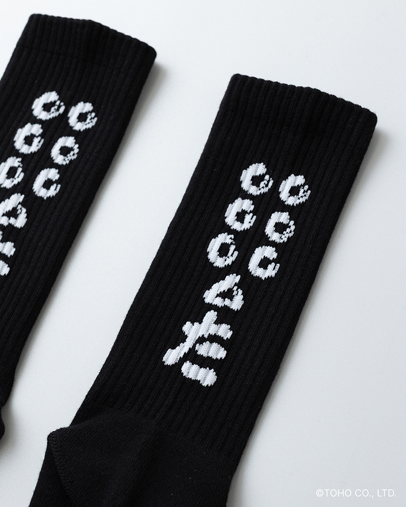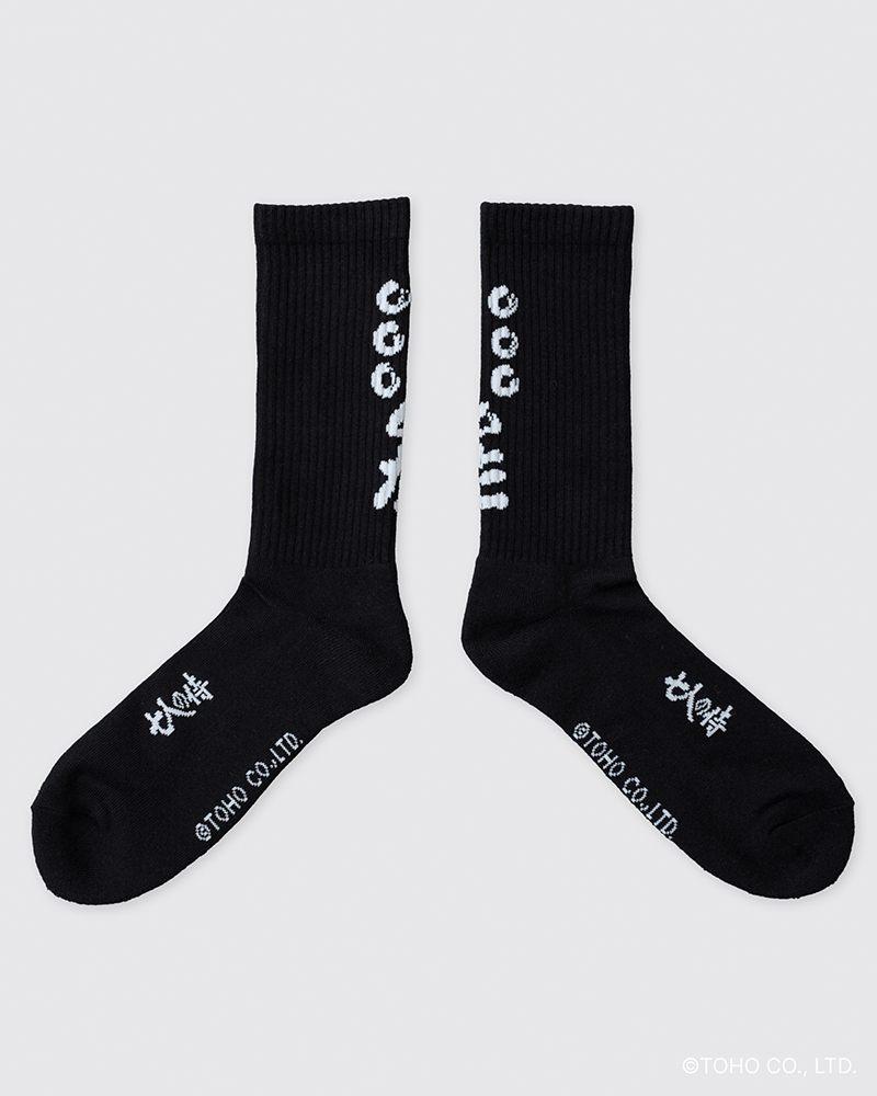 ブラック、ホワイト、ボルドーの三色展開となる旗ソックスは侍と農民がともに戦う結束を掲げた「あの旗印」がモチーフ。6つの円が「6人の侍」、三角形が「菊千代」、「た」の文字が「農民」を表している。模様はすべてジャガード織を採用し織り方で柄を表現。