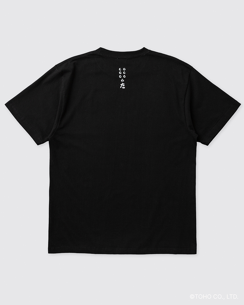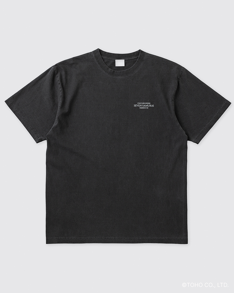 黒ボディのポスターTはフロントに侍たちが佇む姿を写したビジュアルと英字クレジットを配したデザイン。バックの衿元には侍たちが掲げた「あの旗印」があしらわれている。6.6ozのヘビーウェイトTシャツ。プリントには白黒フィルムの荒々しい質感を表現するためにラバープリントのシルクスクリーンが採用されている。