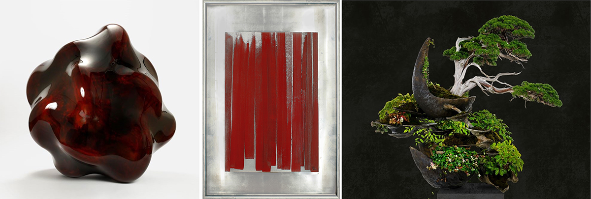 左から)石塚源太「Taxis Groove -Flow Motion」、篠田桃紅「Vermilion from the Past」、平尾成志「渦動」