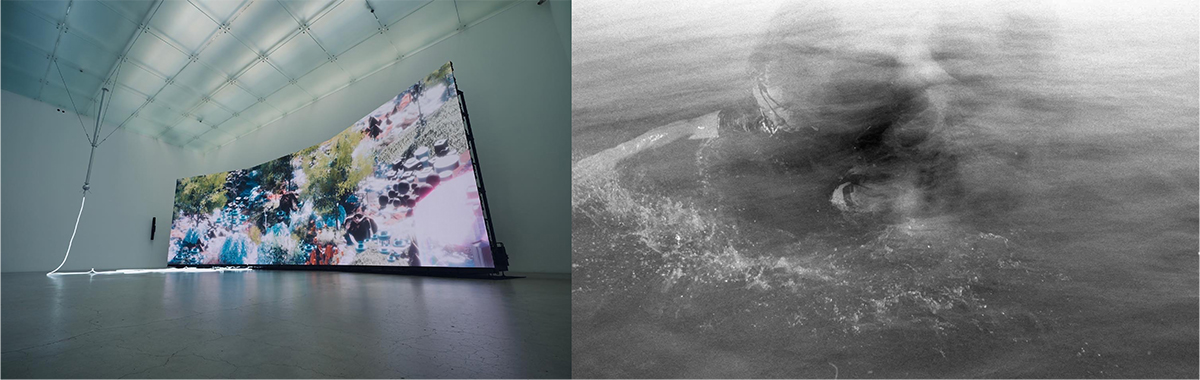 左から《simulation #4 -The Thunderbolt Odyssey- 》(2023)(C) Kenji Agata/《湖独の舞》(2023)撮影:濱田祐史、所蔵:近江ARS