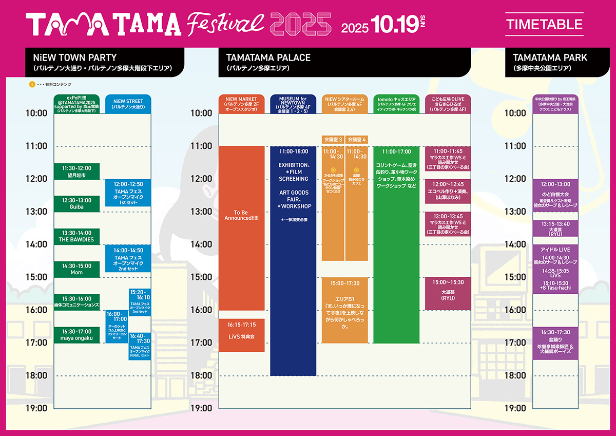 「NiEW TOWN PARTY」(パルテノン大通りエリア〜パルテノン多摩大階段下)、「TAMATAMA PALACE」(パルテノン多摩エリア)、「TAMATAMA PARK」(多摩中央公園エリア)の3エリアを中心に、野外ライブやカルチャーマーケット、カレーフェス、パフォーマンス、トークイベント、キッズエリア、地域まつり、ワークショップを実施。どのエリアも入場無料となる。