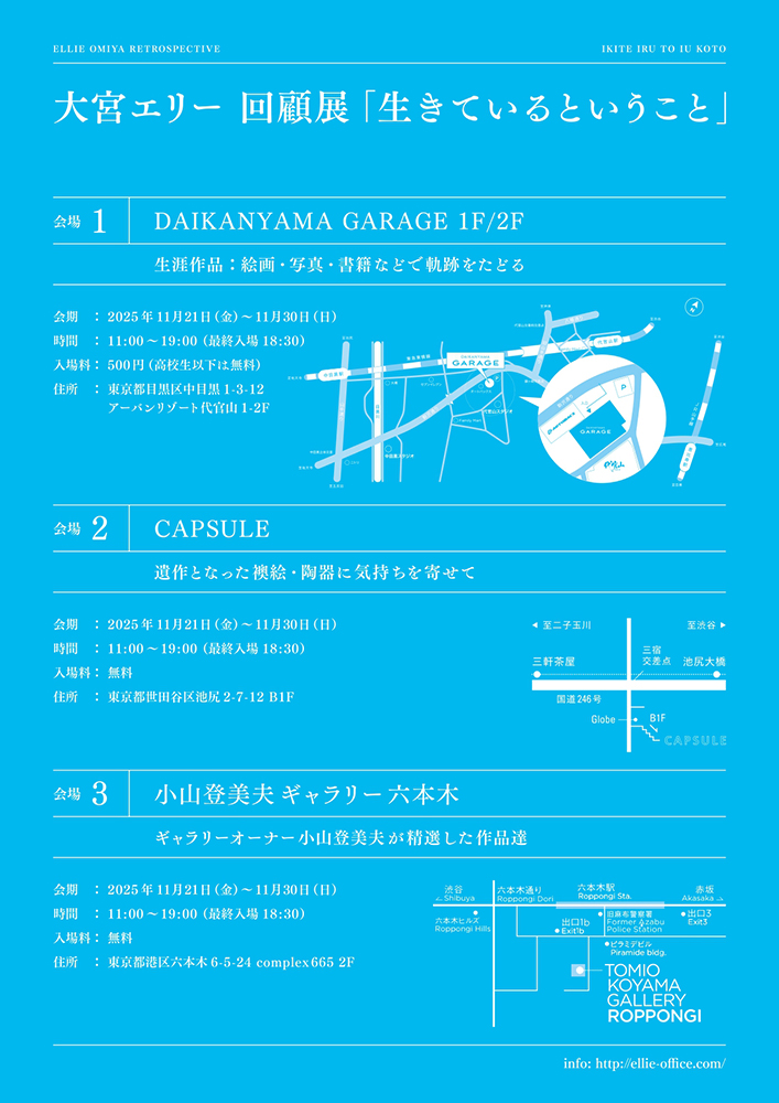 大宮エリー回顧展『生きているということ』が11月21日より東京都内のギャラリー3会場で同時開催される。