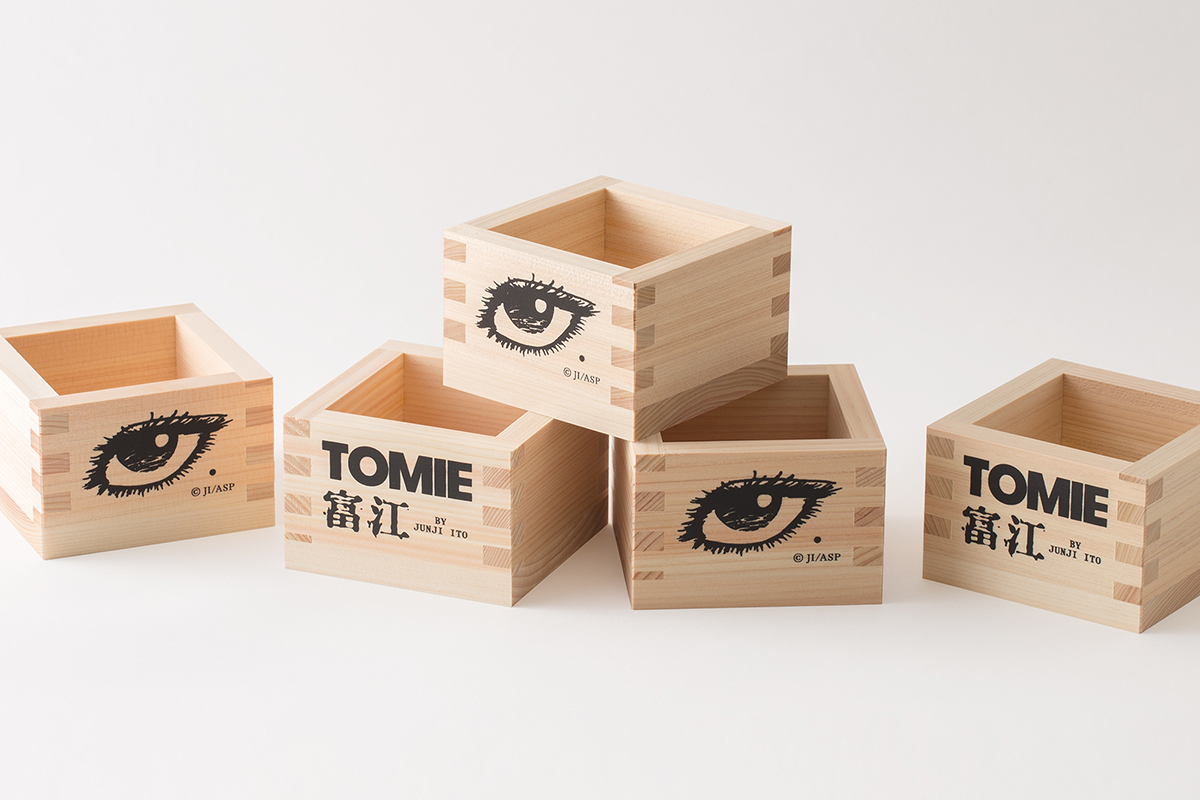 Tシャツには樽から飛び出す富江をレイアウト。トートバッグは「もろみ」のハイライトシーンをコラージュで表現している。枡には富江のイラストをシルクスクリーン印刷。シールは「もろみ」に登場するイラストをセットにしたもので、PP素材にラミネートコートを施すことで耐久性と防水性を向上させたという。