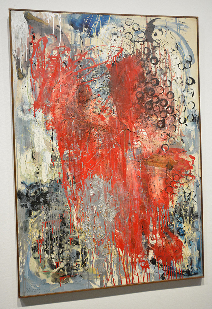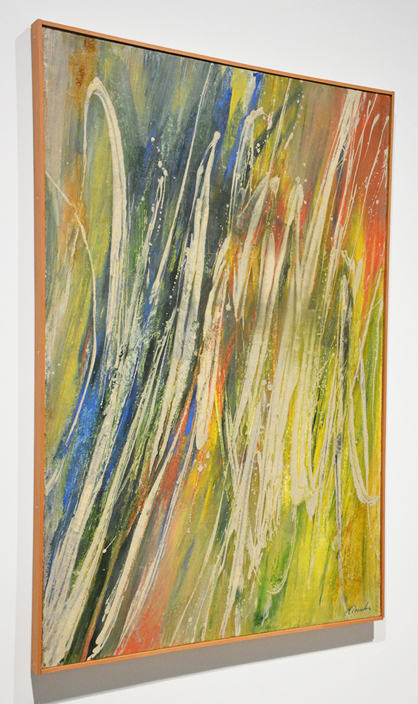 「アクション・ペインティング」の「アクション」という言葉に批評家が反応し、キャンバスに絵の具を叩きつけたり、飛び散らしたり、大胆な身体的パフォーマンスを伴う表現が評価されるようになった。そのため勇ましさや激しさに注目が集まり、男性性と親和性の高いものだったといえる。本展ではそんな「アクション・ペインティング」に対して、女性作家たちがどのように「応答」し、「挑戦」していったのかを作品を通してたどっている。