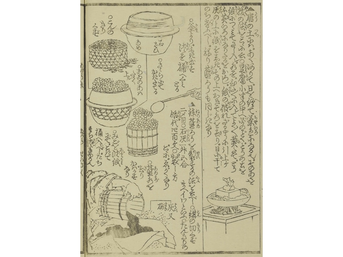 初めに先生が紹介したのは、北斎が亡くなる1年前、89歳のときに出版した『絵本彩色通』。そこには顔料に用いるための練藍蝋(ねりあいろう)を製造する方法が絵と文で描かれています。