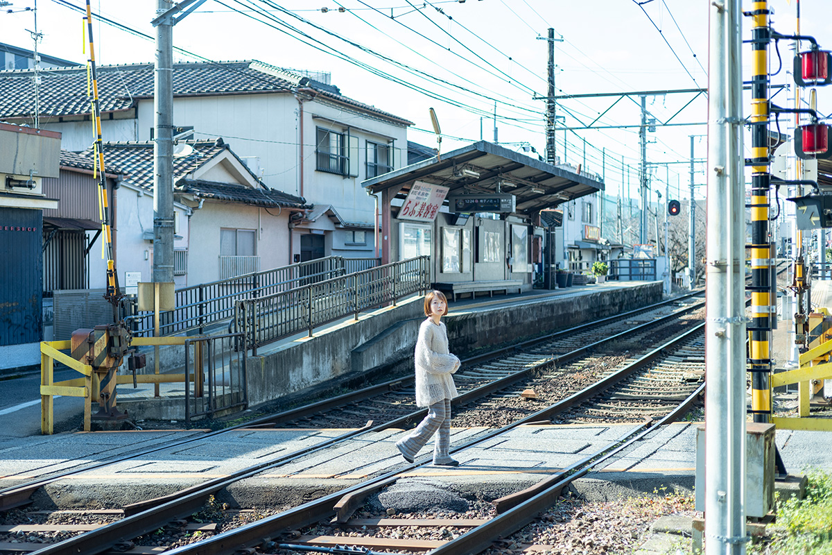 京都のローカルな路面電車「嵐電」の駅で、たなかみさきさんと待ち合わせ