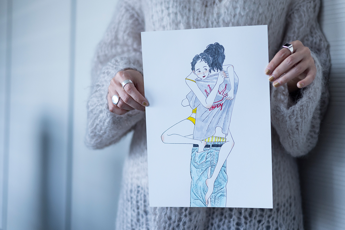 たなかみさきさんによるイラスト作品。女性が男性によじ登っている。「人間関係を対等なものとして描きたいという思いがあります」とたなかさん