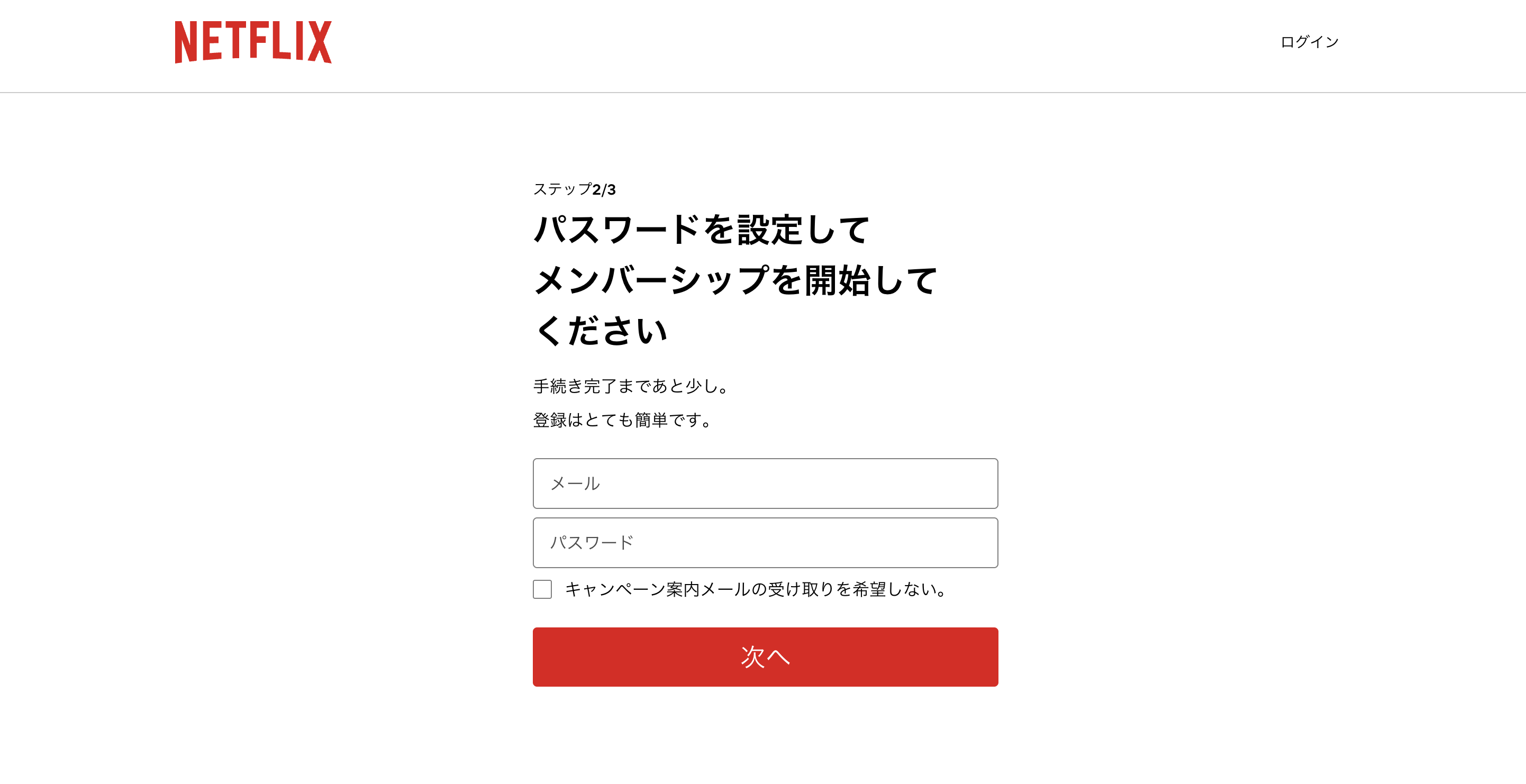 「パスワードを設定してメンバーシップを開始してください」というページに遷移するので、メールアドレスと新規のパスワードを入力し、「次へ」をクリック。