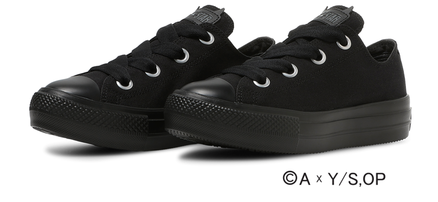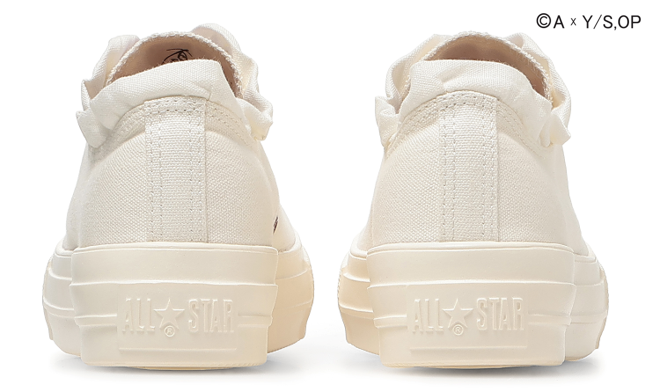 「B小町」モデルは、厚底仕様の「ALL STAR LIGHT PLTS」をベースに、リボンやフリル、ファットレース、黒×黄の配色など、各メンバーの個性を象徴するデザインを採用。全モデル共通で、テレビアニメ『【推しの子】』を象徴する星モチーフの特別タンラベルを配置し、インソールには「B小町」×「コンバース」のコラボレーションロゴ、タン裏には各キャラクターのサインをプリント。シューズ内部には公式衣装を示す苺プロダクションのクレジットが施されている。