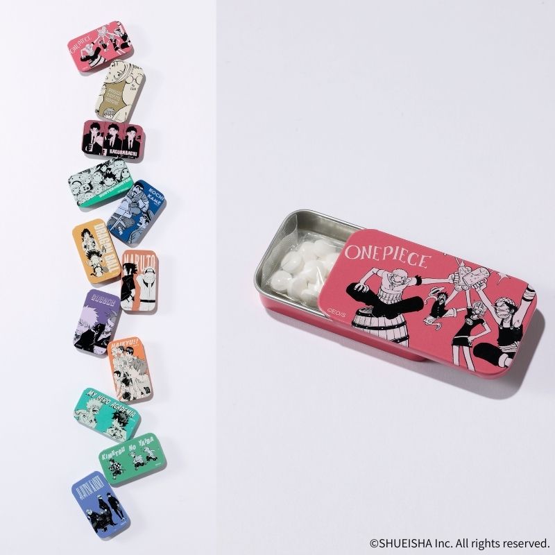 スライド缶タブレット(右画像上から『ONE PIECE』/『SAKAMOTO DAYS』/『カグラバチ』/『HUNTER×HUNTER』/『こちら葛飾区亀有公園前派出所』/『DRAGON BALL』/『NARUTO-ナルト-』/『BLEACH』/『ハイキュー!!』/『僕のヒーローアカデミア』/『鬼滅の刃』/『呪術廻戦』)/各¥1,210(税込)