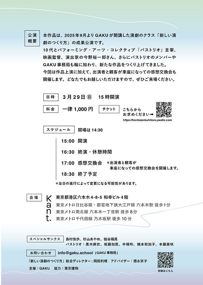 現在チケットのキャンセル待ちを受付中。詳細はGAKUのオフィシャルサイトを確認しよう。オフィシャルサイトには生徒とGAKU事務局の演劇創作を巡る鼎談記事なども公開されている。