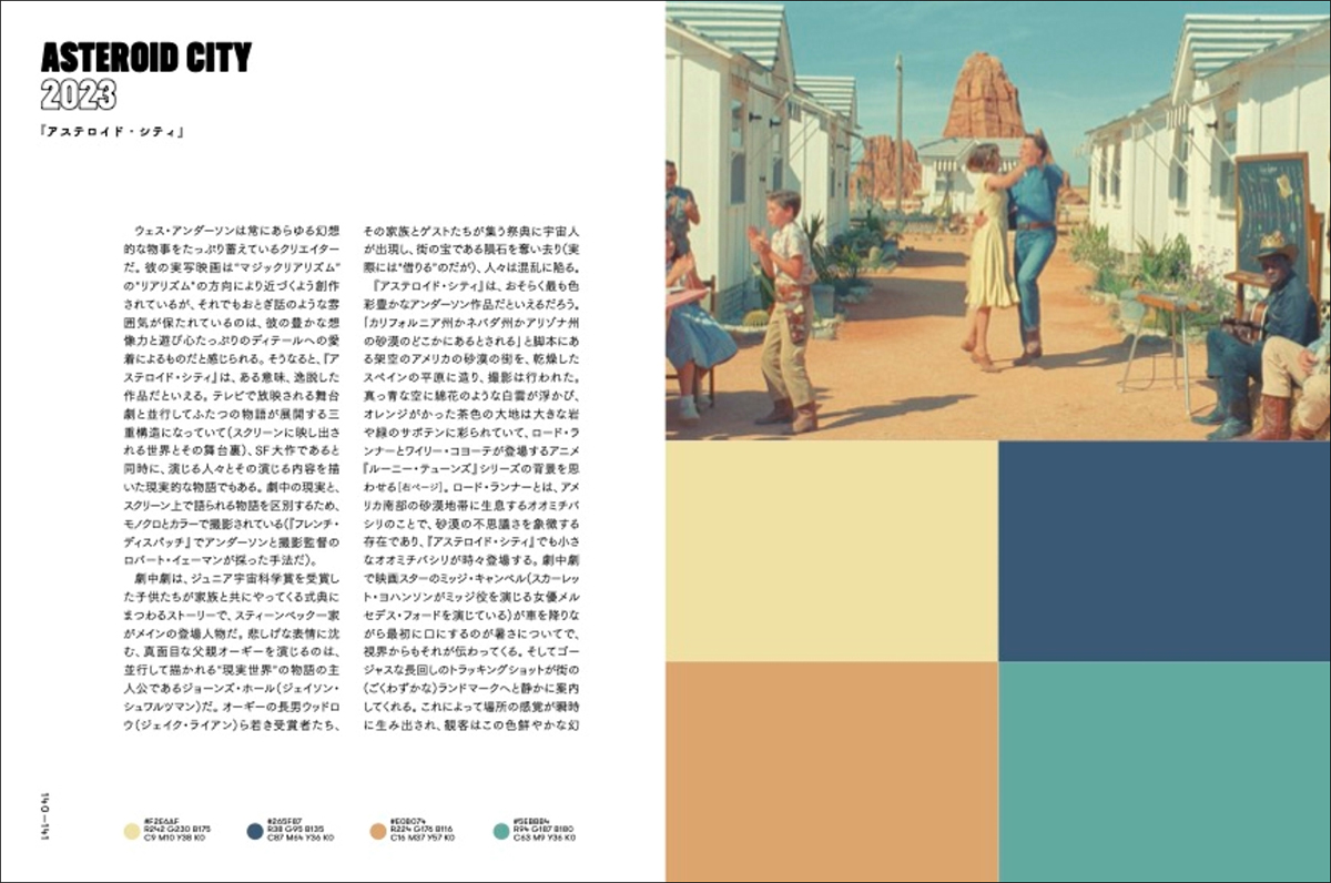 同書は、ウェス・アンダーソン監督のデビュー作『アンソニーのハッピー・モーテル』から最新のNetflix短編作品まで計17作品をとりあげ、各作品の印象的なシーンから抽出したカラーパレットを通じて色彩が物語や感情表現に果たす役割を読み解くビジュアルブック。監督特有の緻密な配色の組み合わせと、その視覚効果を体系的に学べるという。著者はハンナ・ストロング。翻訳は石田亜矢子。