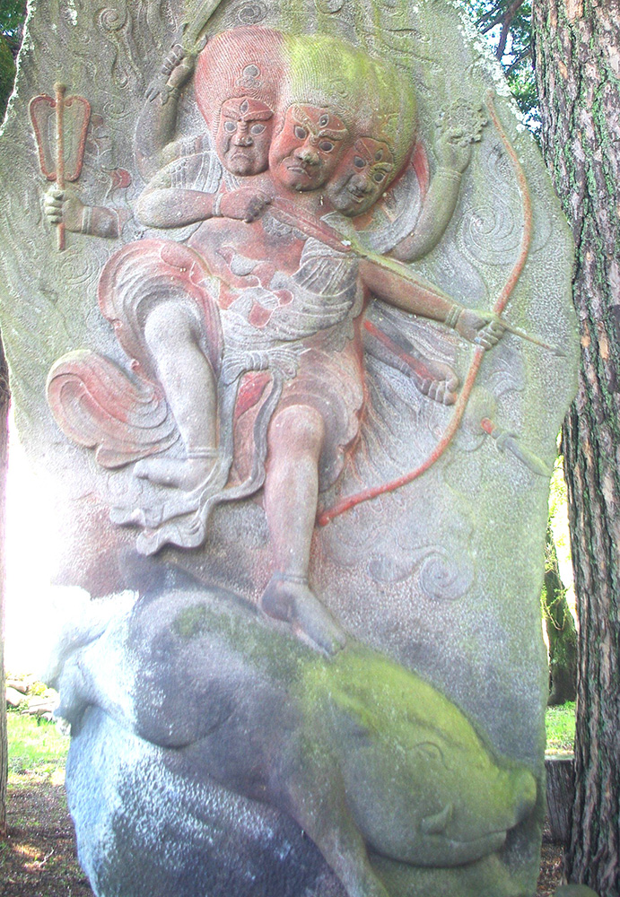 災厄から身を守り、武士や交通・運送業者の守り本尊として信仰される摩利支天は、猪に乗っている姿が大きな特徴である(参考写真)。陽炎(かげろう)を神格化した神であり、木曽御嶽山(摩利支天山)、乗鞍岳(摩利支天岳)、甲斐駒ヶ岳など、山岳信仰の対象である山の一峰が「摩利支天」と呼ばれている場合がある。