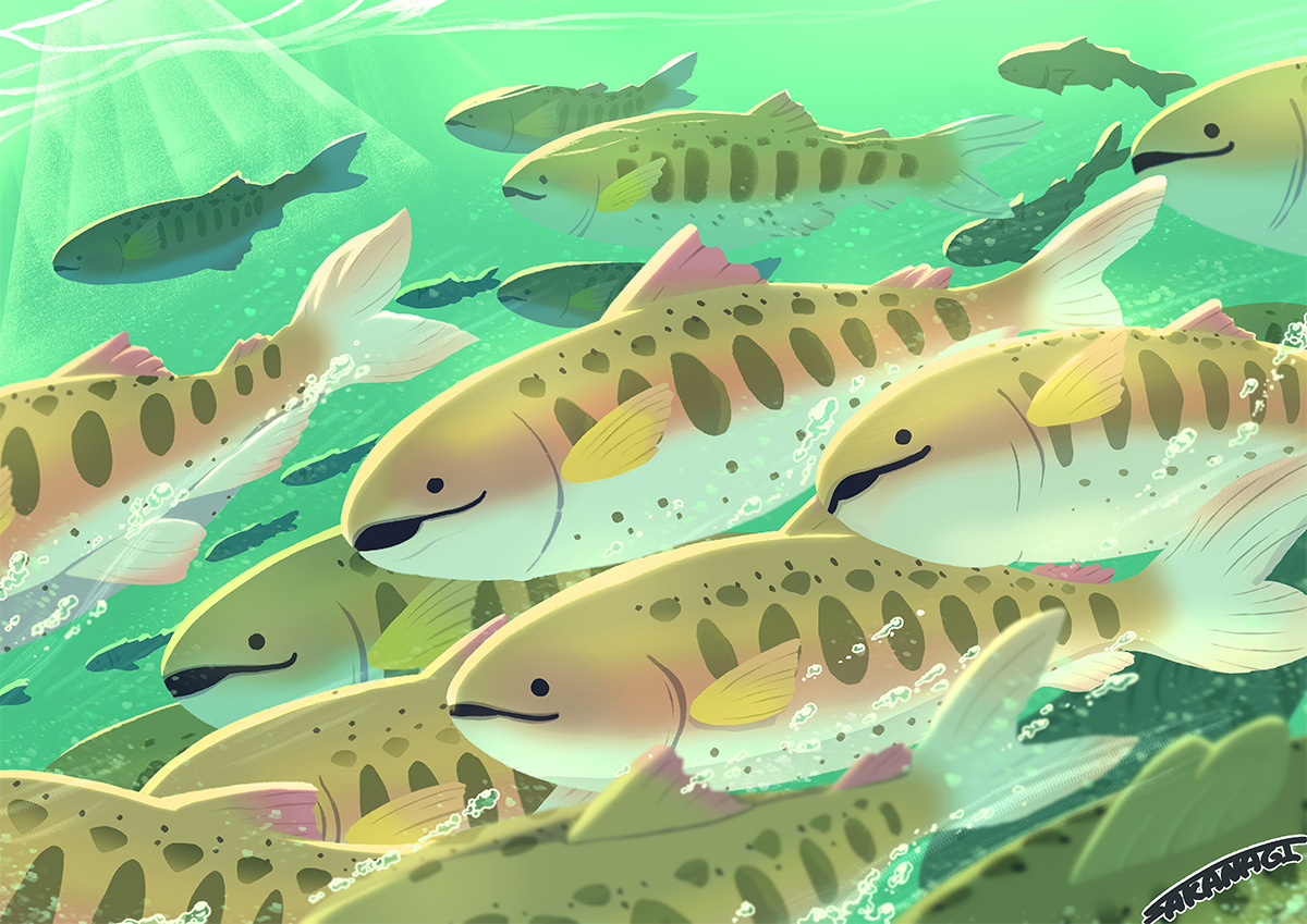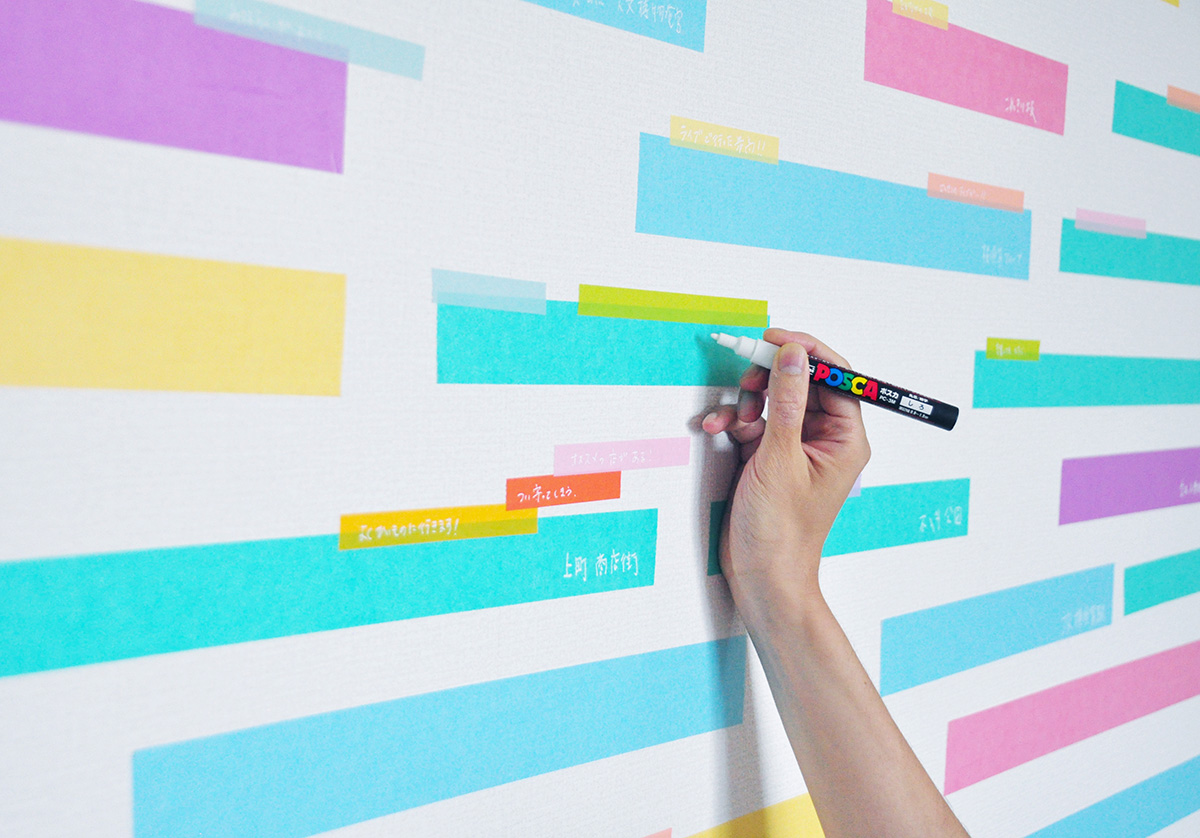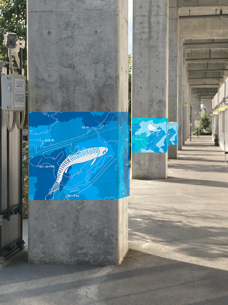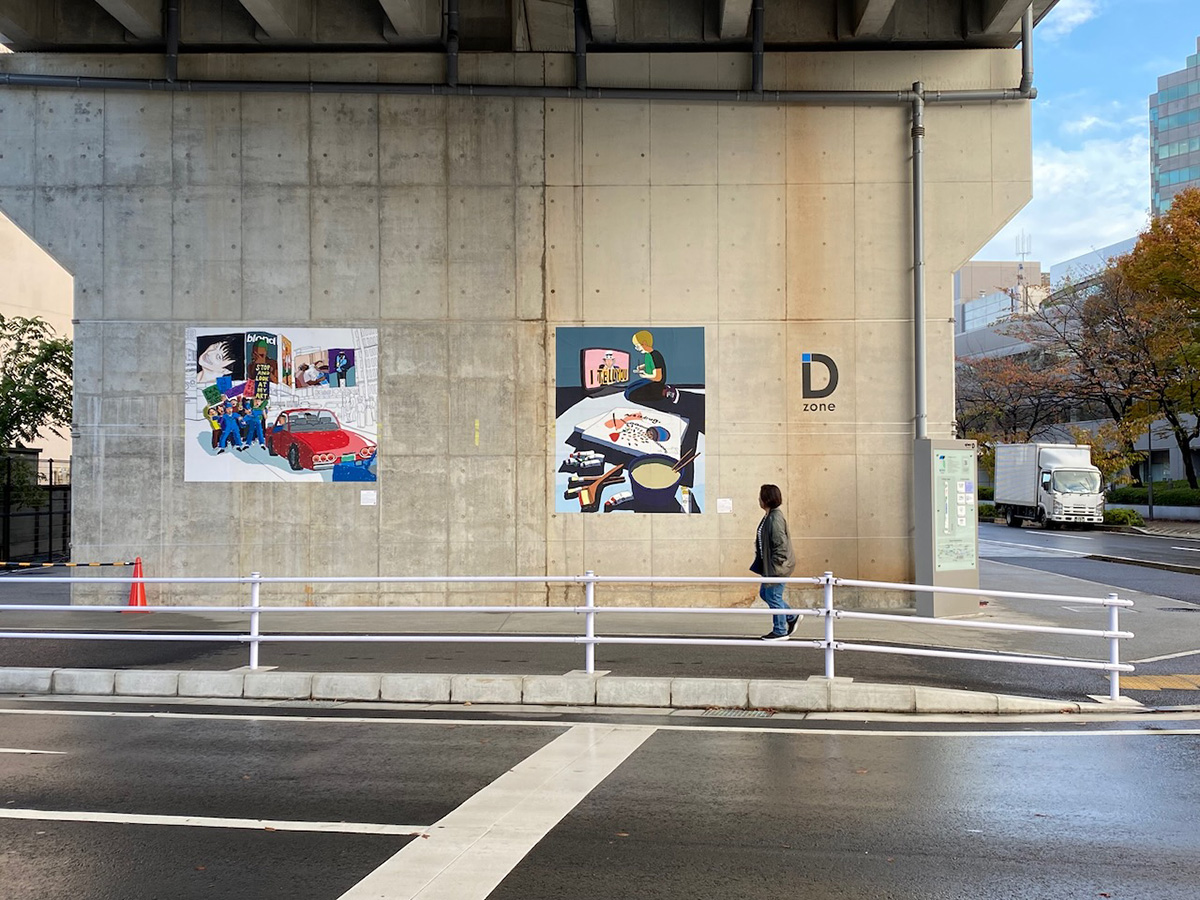 遠峯未来は横浜市内を流れる帷子川をテーマに川に暮らす生き物を調査し、その生物が見つかった場所を地図とともに描き、空間に展開。犬山さきは「高架下の落書き」をモチーフに普段言葉にしないような柔らかな気持ちを表現した。