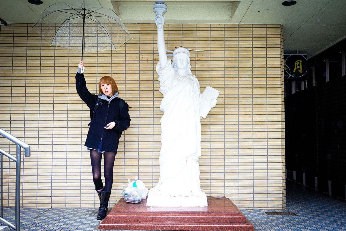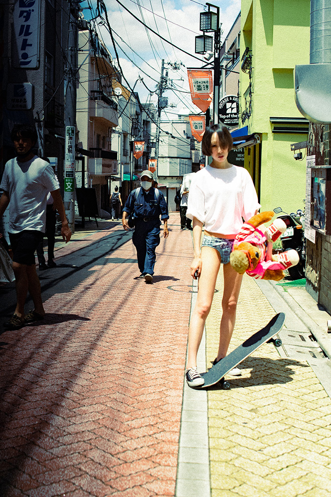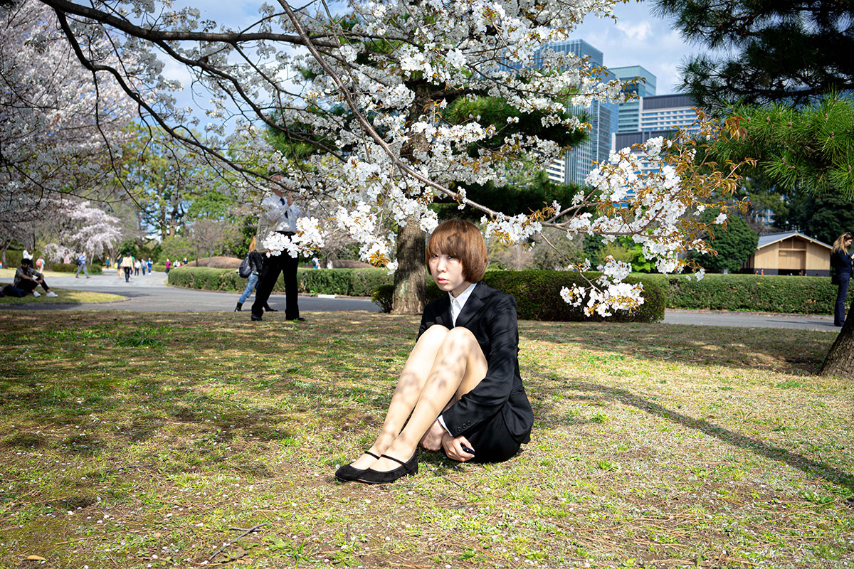 濱未亜のセルフポートレートは、にぎやかな都市の通りの中に、時に場違いとも思える立ち位置で彼女自身を配置している。周囲の環境と必ずしも一致しないポーズで写る彼女には、どこかユーモアが漂う。時には薄着で挑発的な視線をこちらに向ける一方、別の場面では女子学生や若いビジネスウーマンとして、都市生活に完全に溶け込んだ姿を見せる。金髪から黒髪へと姿を変えながら、彼女は恐れずに周囲の空間を自らのものとし、その自立性を示している。ある意味でこれは、被写体が周囲の環境に影響を与えることを示す実演ともいえるだろう。