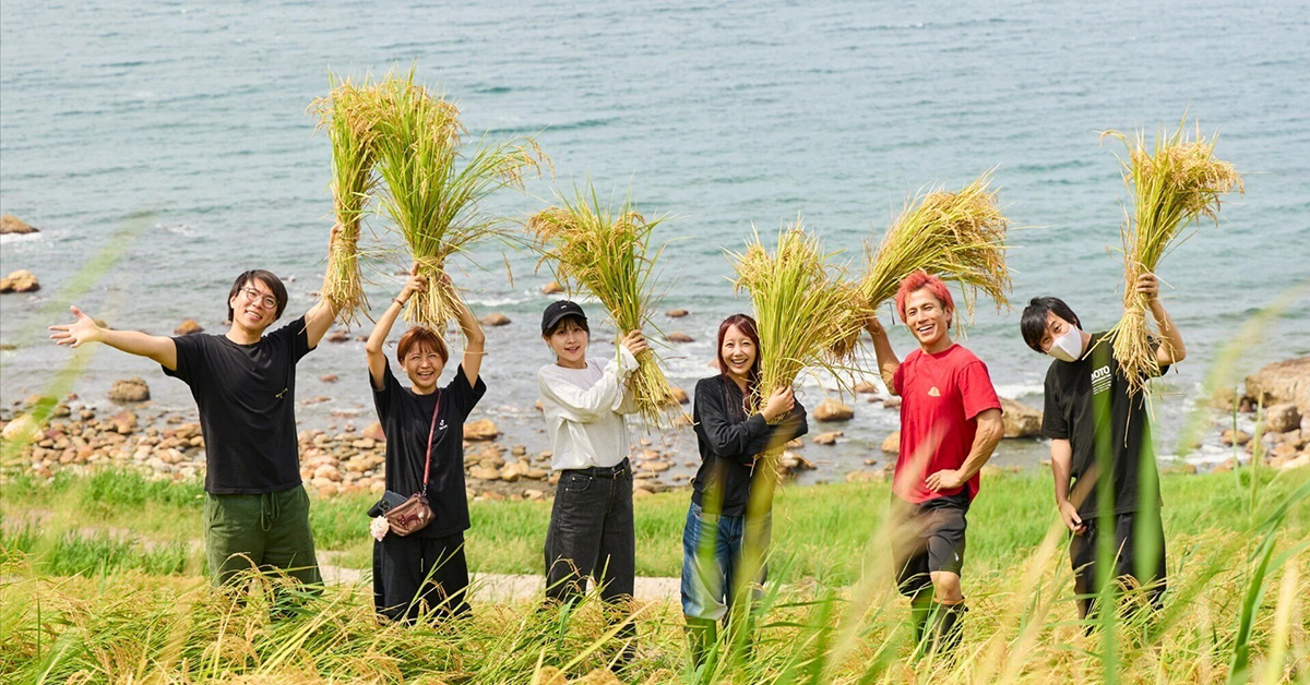 『TikTok LIVE Local Love in 石川』の1コマ、2025年9月に石川県輪島市白米町にある棚田、白米千枚田を訪れた。同年5月に植えた稲を、あきとんとん🤔さん、あか(AKA)さん、ぴと@旅行WEBライターさん、オムライス兄さん Omurice Boy🇯🇵さん、そば湯さんとともに収穫した。八木さんは左から3番目。