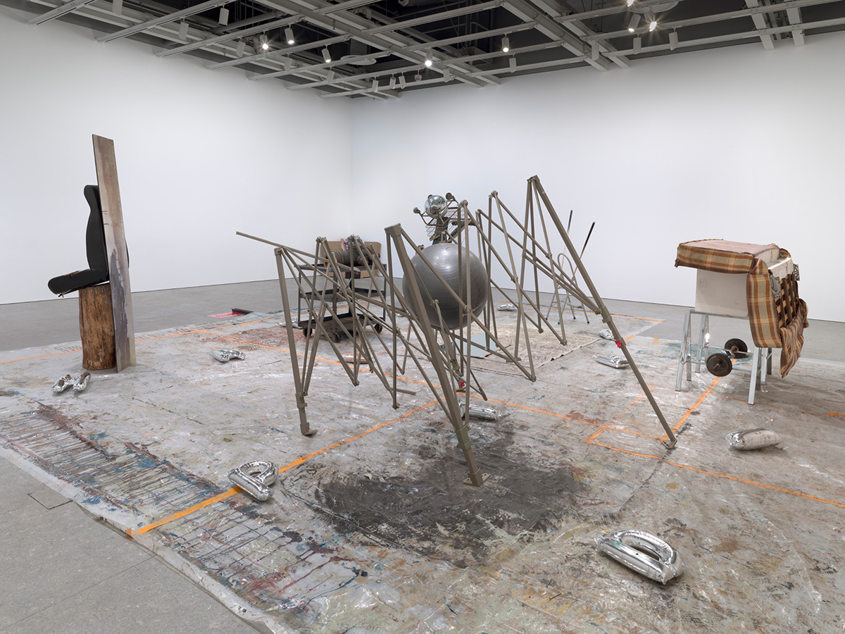 Ser Serpas, “taken through back entrances subtle fate matching matte thing soiled…”, 2024, found objects, plastic tape, oil paint. Installation view at Whitney Museum of American Art, New York. From the 2024 Whitney Biennial.