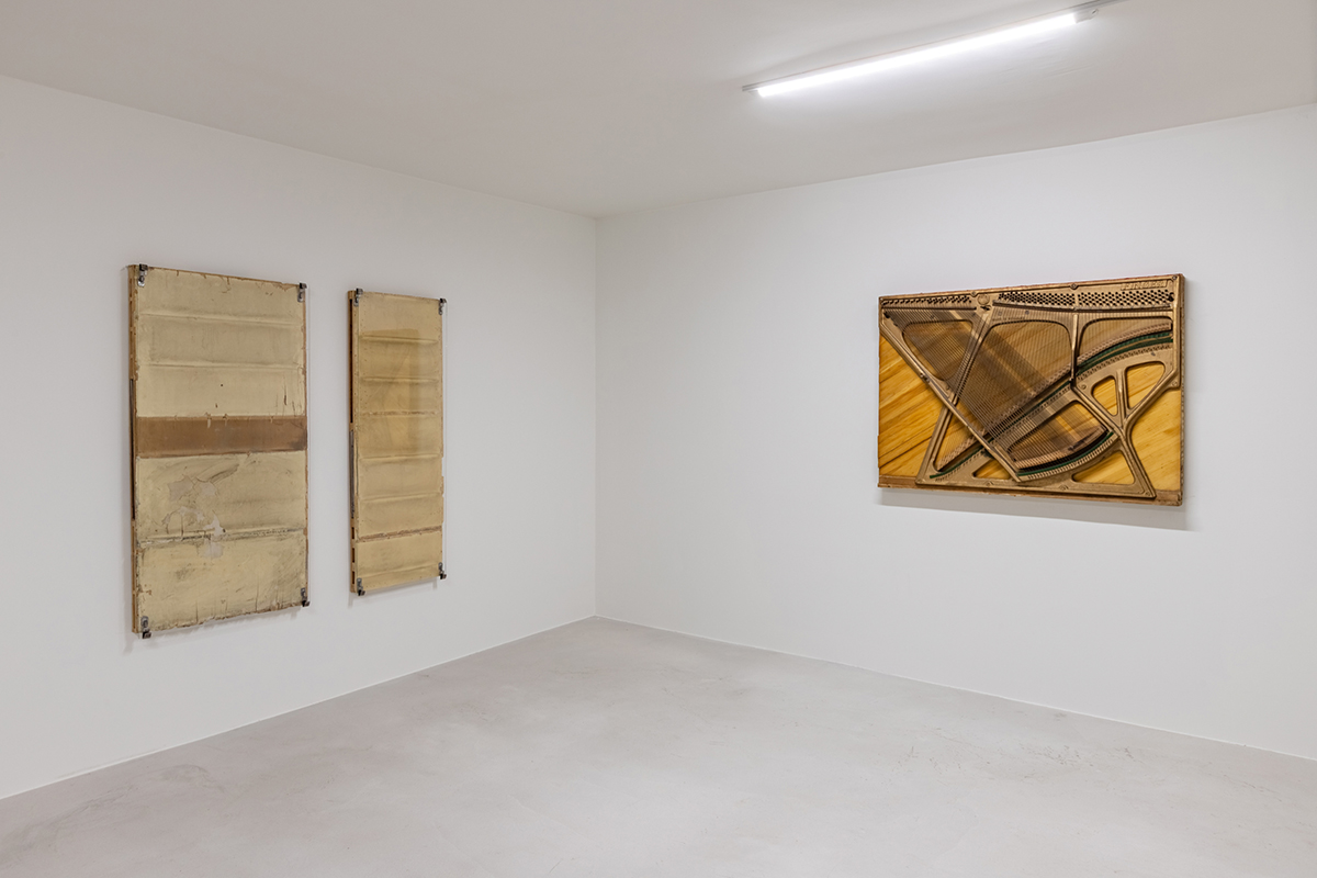 Right: Rafik Greiss, "Bitter to be present", 2025, plaster plates, patinated, 215 x 482 x 1.8 cm (Install at SIMIAN, Copenhagen, Denmark, curated by Fabian Flückiger) © Rafik Greiss.